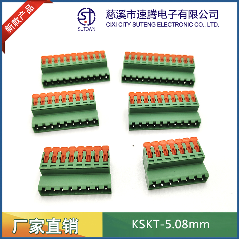 型號:KSKT-5.08mm間距:5.08mm極數:2-24P電氣性能 額定電壓:300V額定電流:15A使用線徑:24-12WG(2.5mm2)環境溫度:-40℃~+105℃瞬時溫度:+250℃,5s耐電壓:AC4000V/Min接觸電阻:20MΩ絕緣電阻:5000MΩ/1000V扭矩:0.4Nm剝線長度:7-8mm材質和電鍍 塑件:PA66,UL94V-0觸點材料:磷青銅,鍍鎳